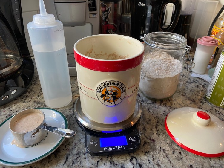 Next I scoop out 100g of starter (scale now reads -100g).
