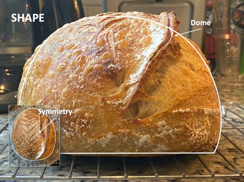 On the exterior of the loaves I look at Shape, Texture, Color and Bloom (or Oven-Spring). On the interior I look at the Crumb.