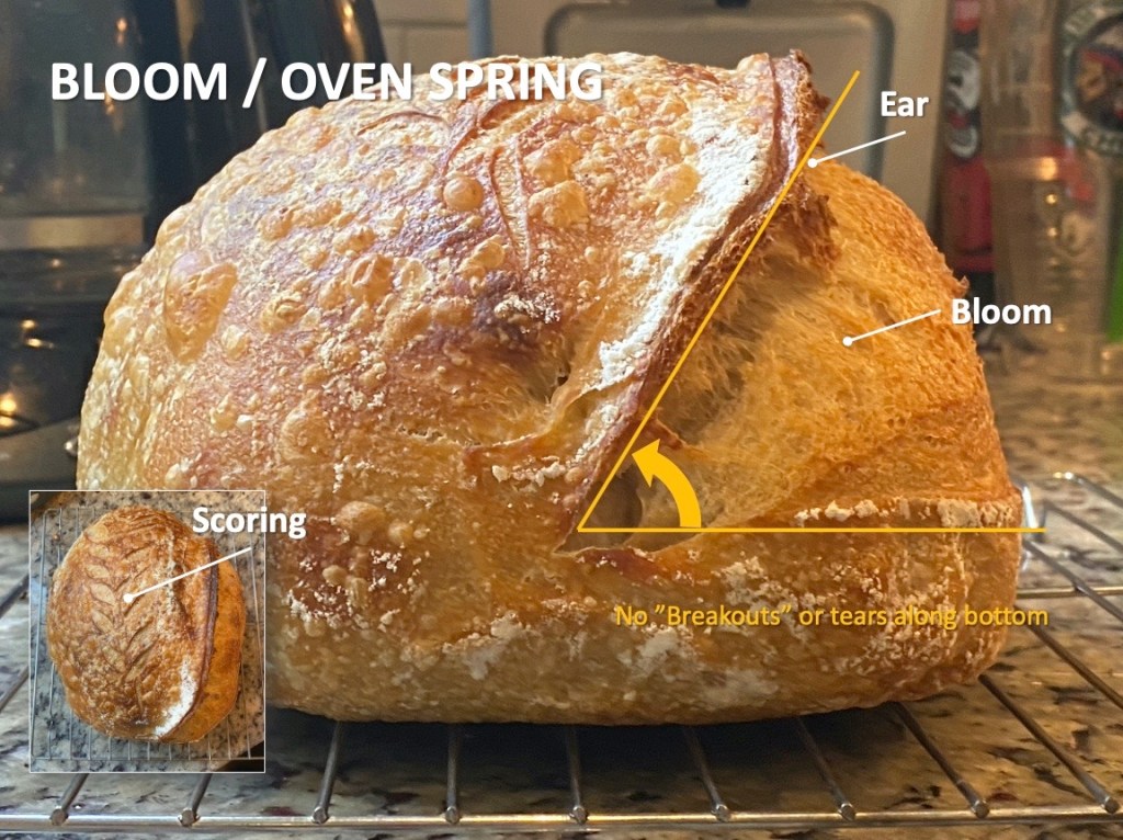 BLOOM / SPRING – The Bloom or “Oven Spring” is a very strong indication of my proving effectiveness. It also tells me about the strength of my gluten structure as well as how effective and consistent I am with my slashing / scoring technique.