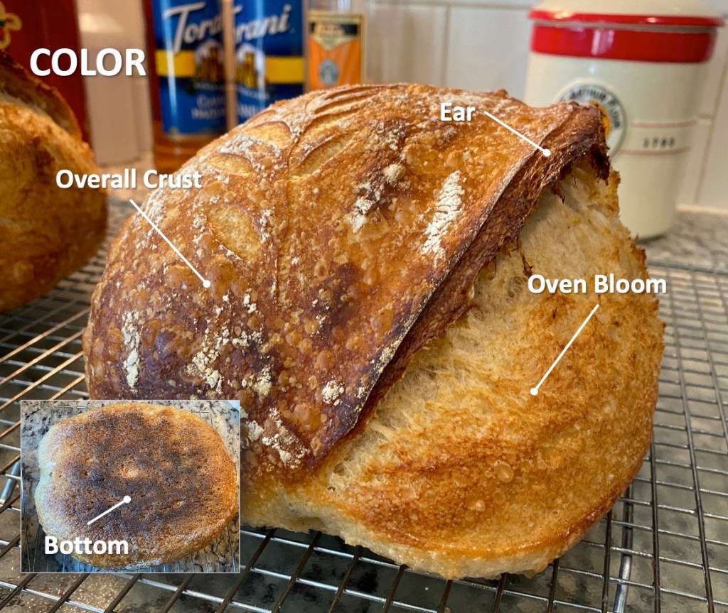 TEXTURE – For the texture I look at the dimpling (helped by having a cold dough from the fridge directly to the Dutch Oven), Scoring, Ear and overall Bloom. These aspects tell me about my baking temperatures and timing. They also indicate moisture content in the Dutch Oven. The Ear and Bloom (primarily) and the decorative scoring (secondarily) tell me about the quality of the proving and whether it was under/over-proved.
