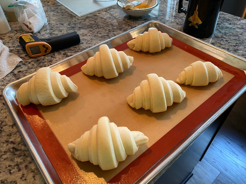 I’m also only baking one tray at a time. Think dropping ice cubes into a drink. I preheated my oven 25° hotter than normal and reset to allow for temp drop when I loaded the tray. I’m doing one tray at a time to lessen the amount that needs to come to baking temps (tray + croissants).
