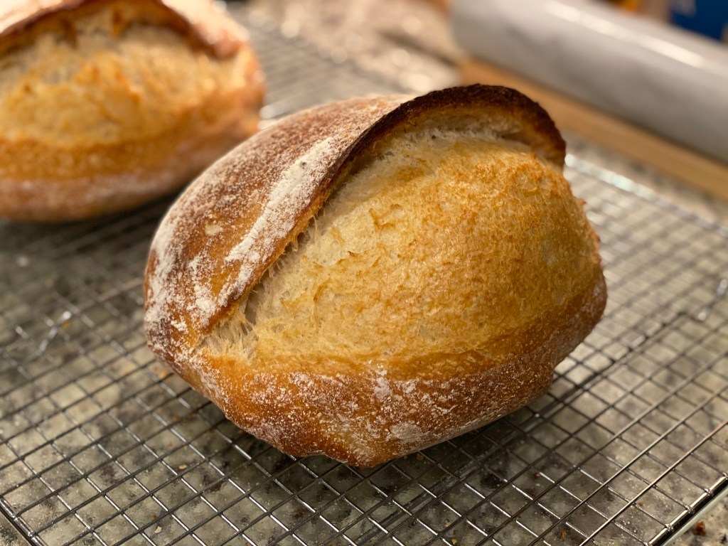 Overall, the oven bloom was better but not as good as I’ve previously experienced. Crust dimples were less (expected) since I didn’t bake directly from the fridge. Ear was OK on one loaf and less pronounced on other.