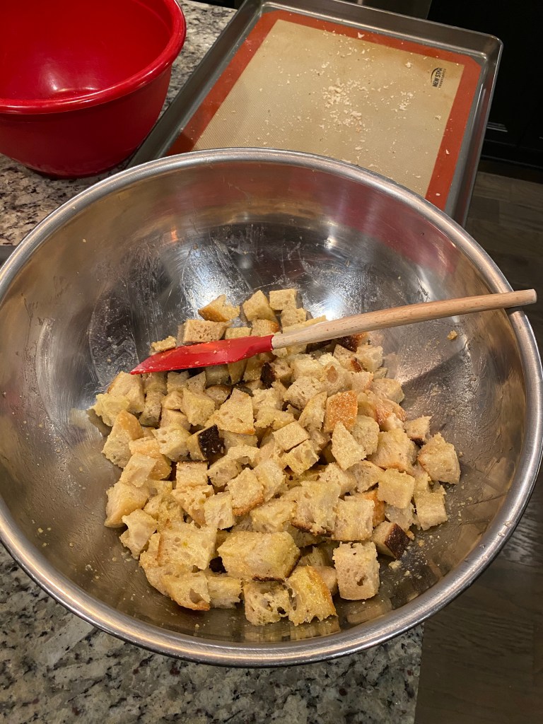 Cut it into cubes (6 Cups?). Added 6T olive oil, 6T melted butter, 3T minced garlic, 3T Parmigiana Cheese, and 1T sea salt. Mixed well and baked at 375°F.