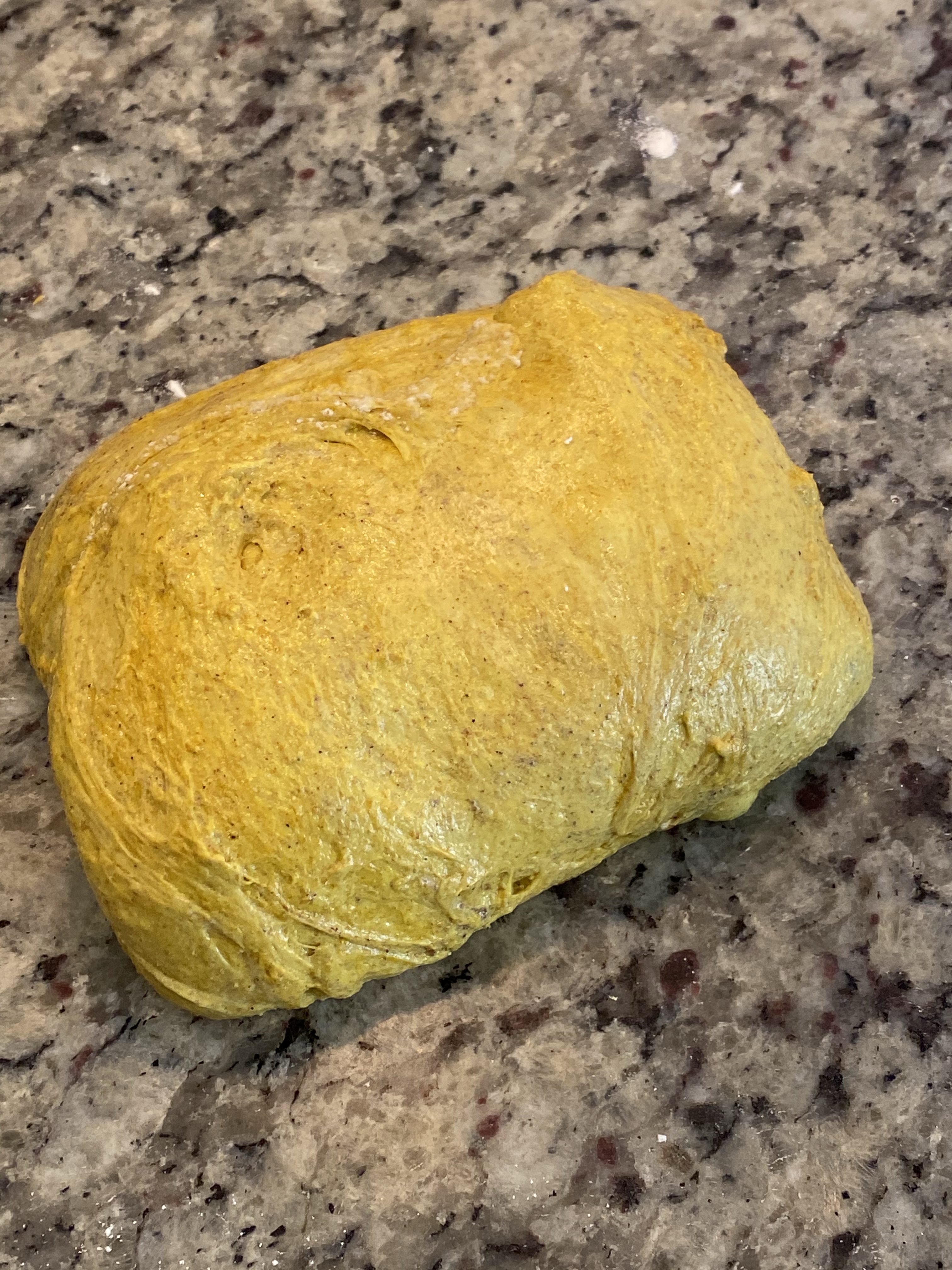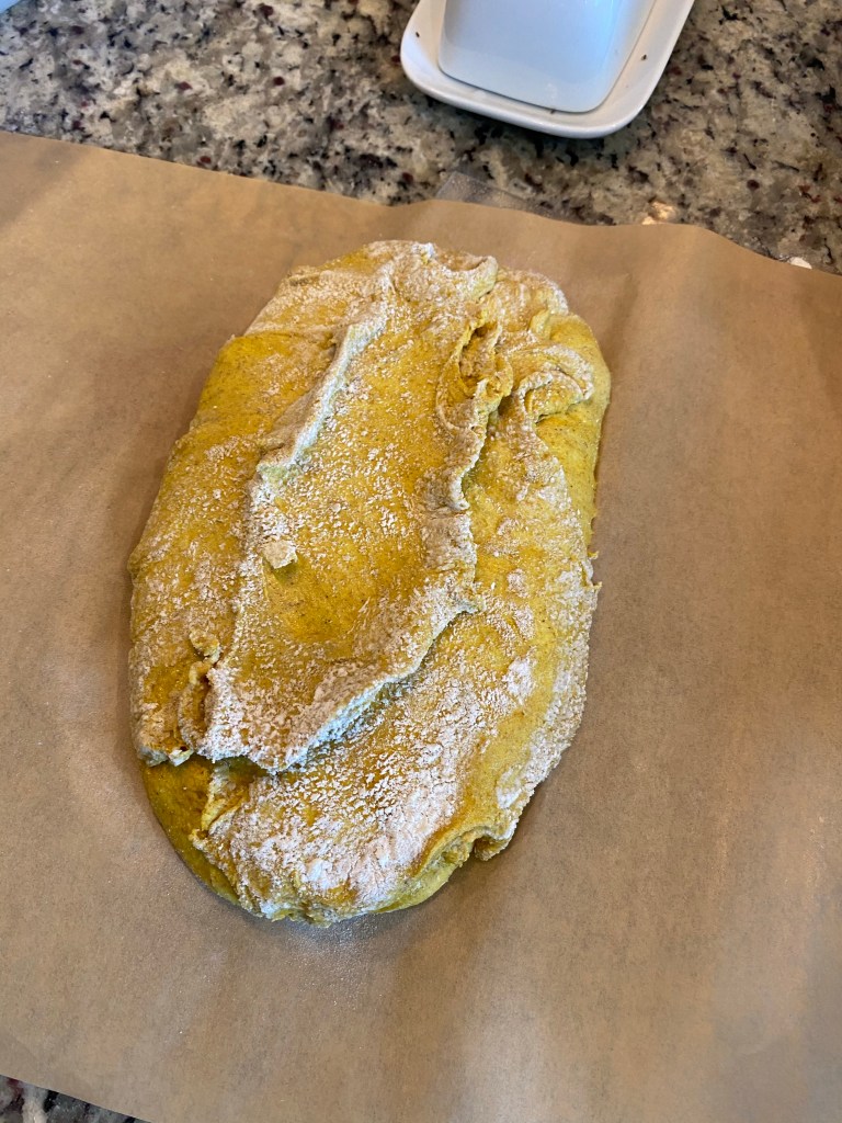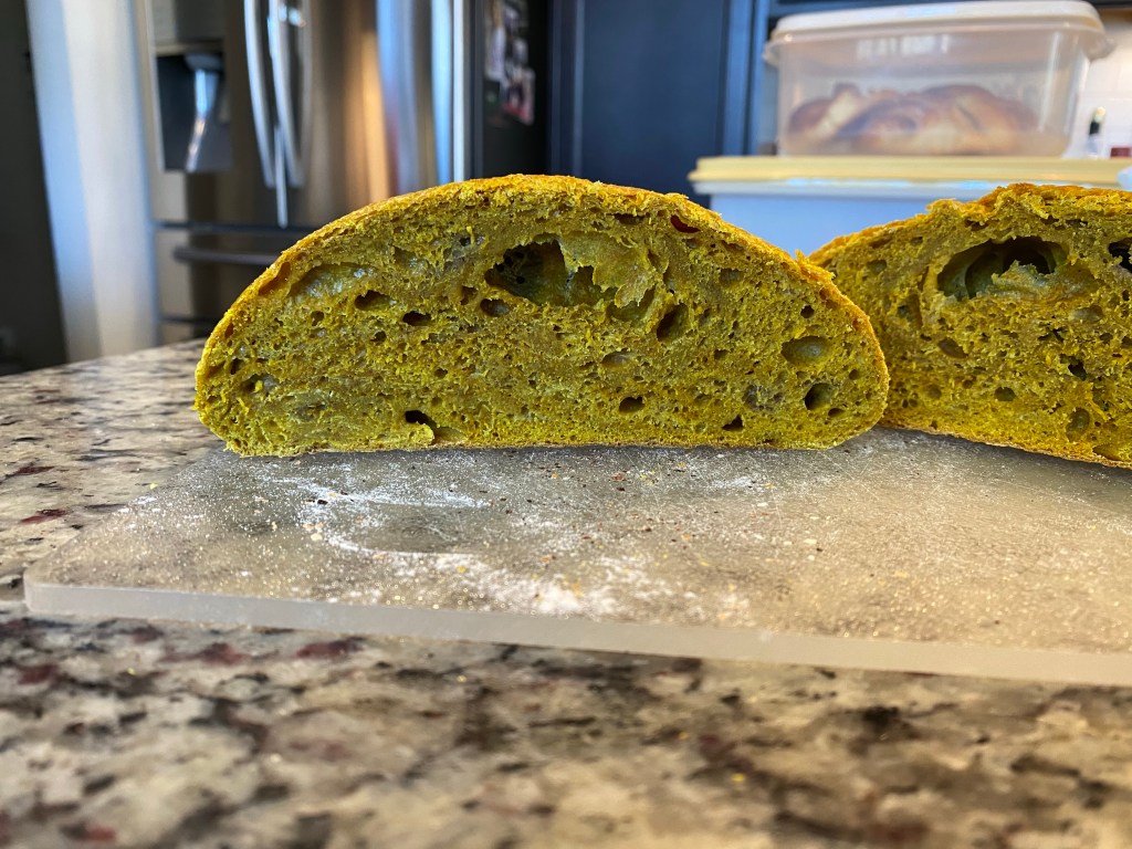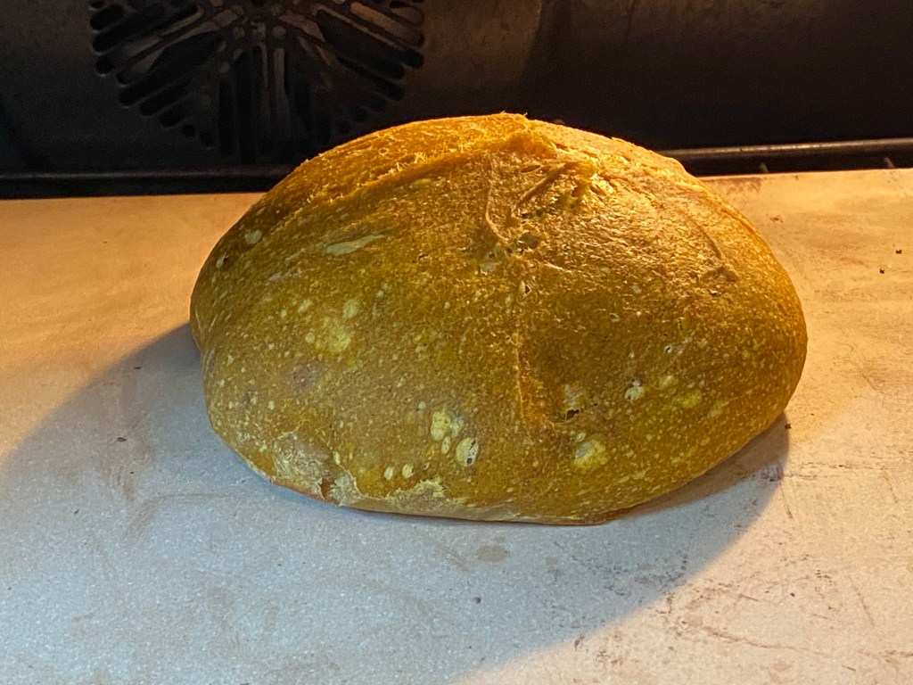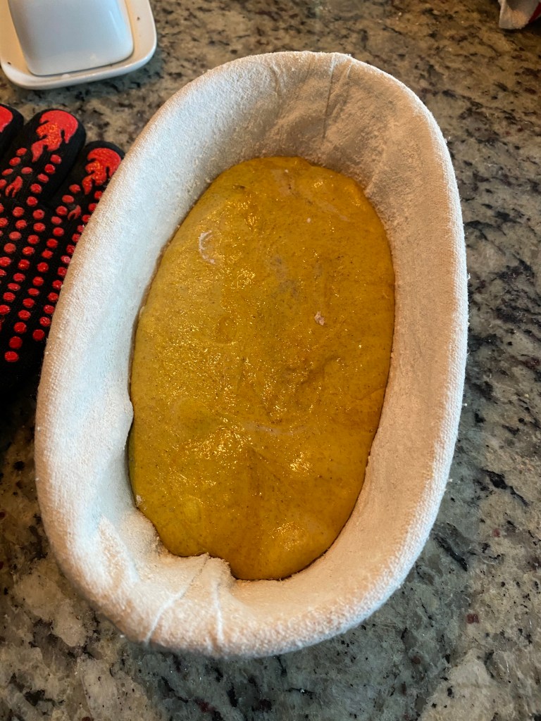 As the loaves above were baking I pulled out the banneton with the Turmeric-cinnamon dough. As expected it wasn’t filling the banneton as full as the other loaves. I expected this because the loaf weight was about 2/3 my other loaves. I also expected different results due to the added ingredients.