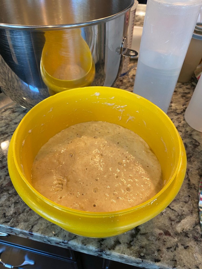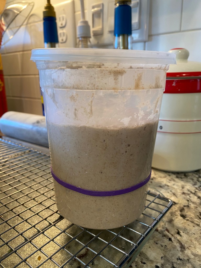 I typically bake sourdough bread once a week. Pre-COVID-19 I traveled for work Monday – Thursday. I would store my starter in the fridge. Thursday evening I usually returned home at 9:30pm. I’d feed my starter about 10pm on a 1:1:1 ratio (110g each of starter, water and my 50/50 blend of Bread and Whole Wheat King Arthur flour).