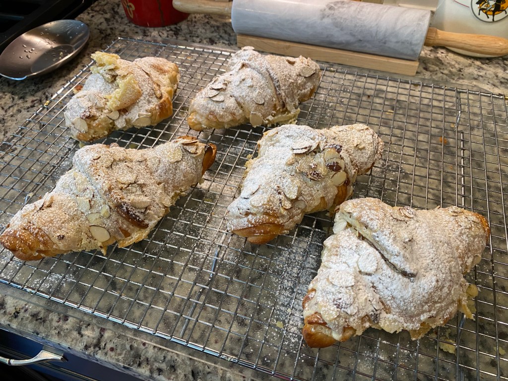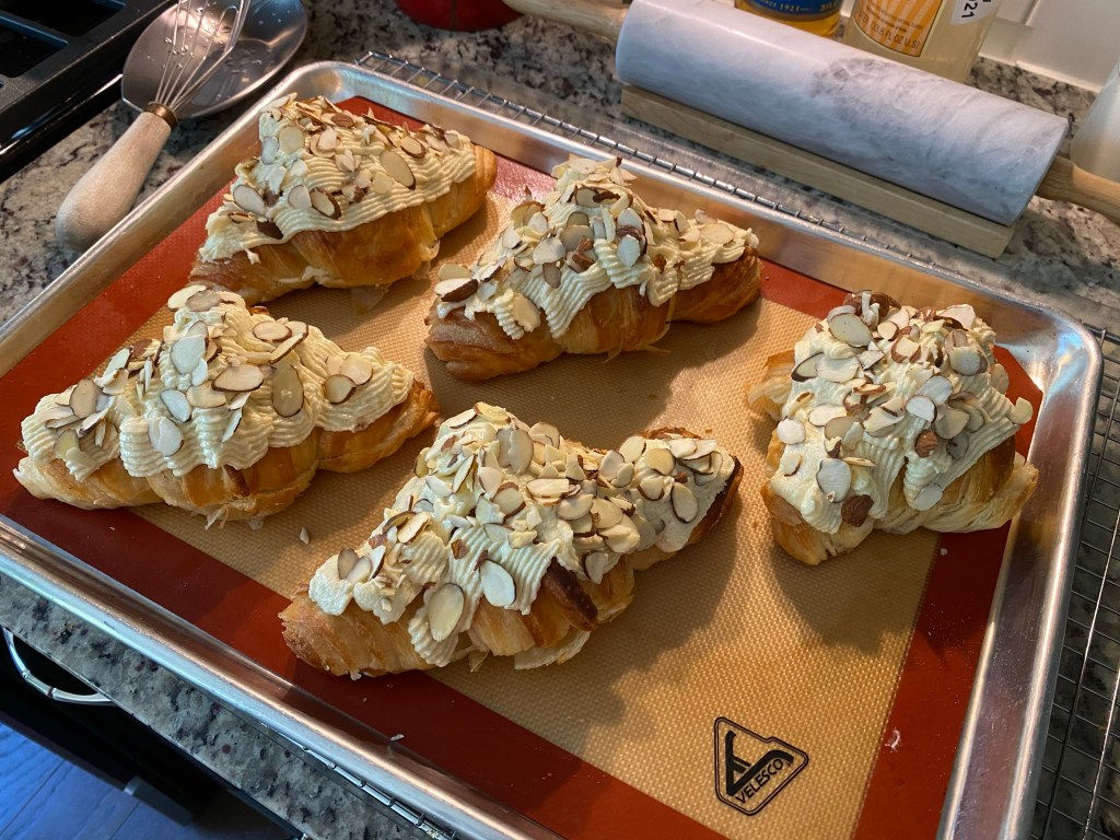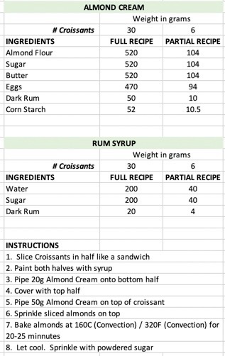 Basically, the recipe calls for slicing day-old croissants in half, slathering both halves with rum syrup, piping almond cream between and on top, adding sliced almonds then baking. Sprinkle powdered sugar on after they are out and cool.