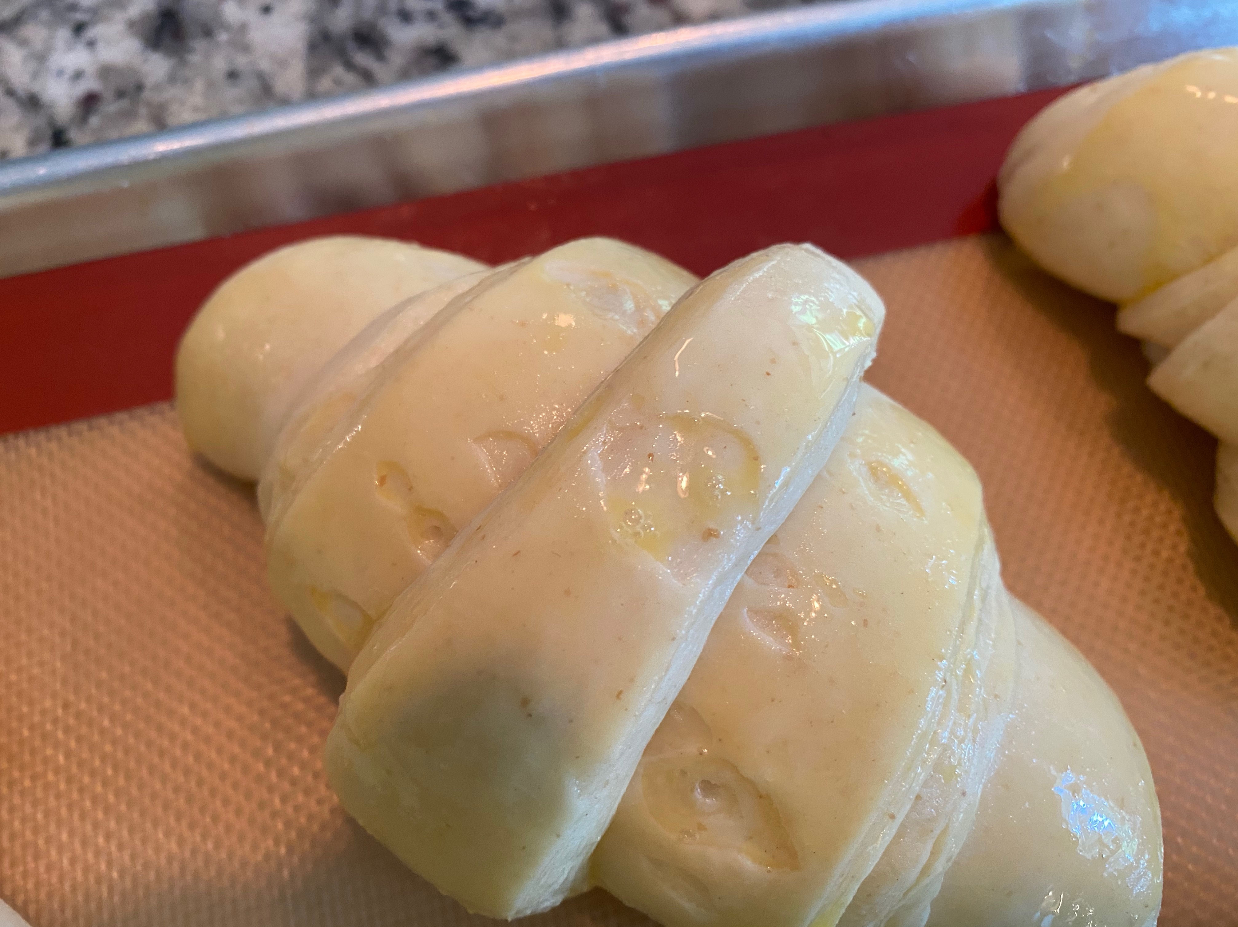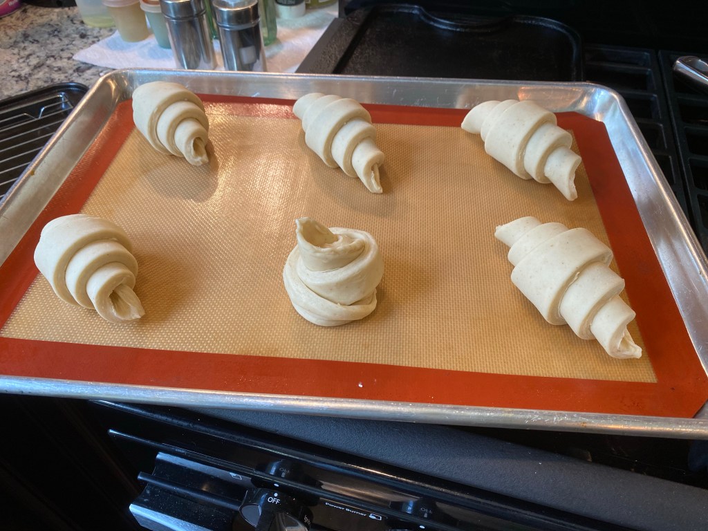 I felt pretty good about how the dough responded and cut out the croissants. I have very little waste since I take the cutting on the ends and roll another scrap piece. The scrap normally gets glazed with apricot jam once baked. Note: these NEVER last to be fully cooled!
