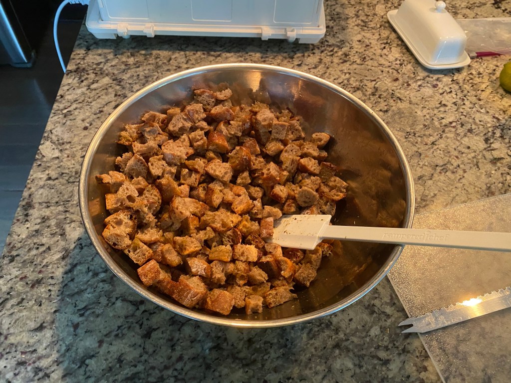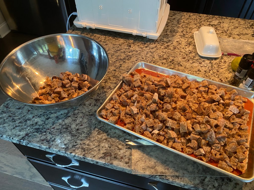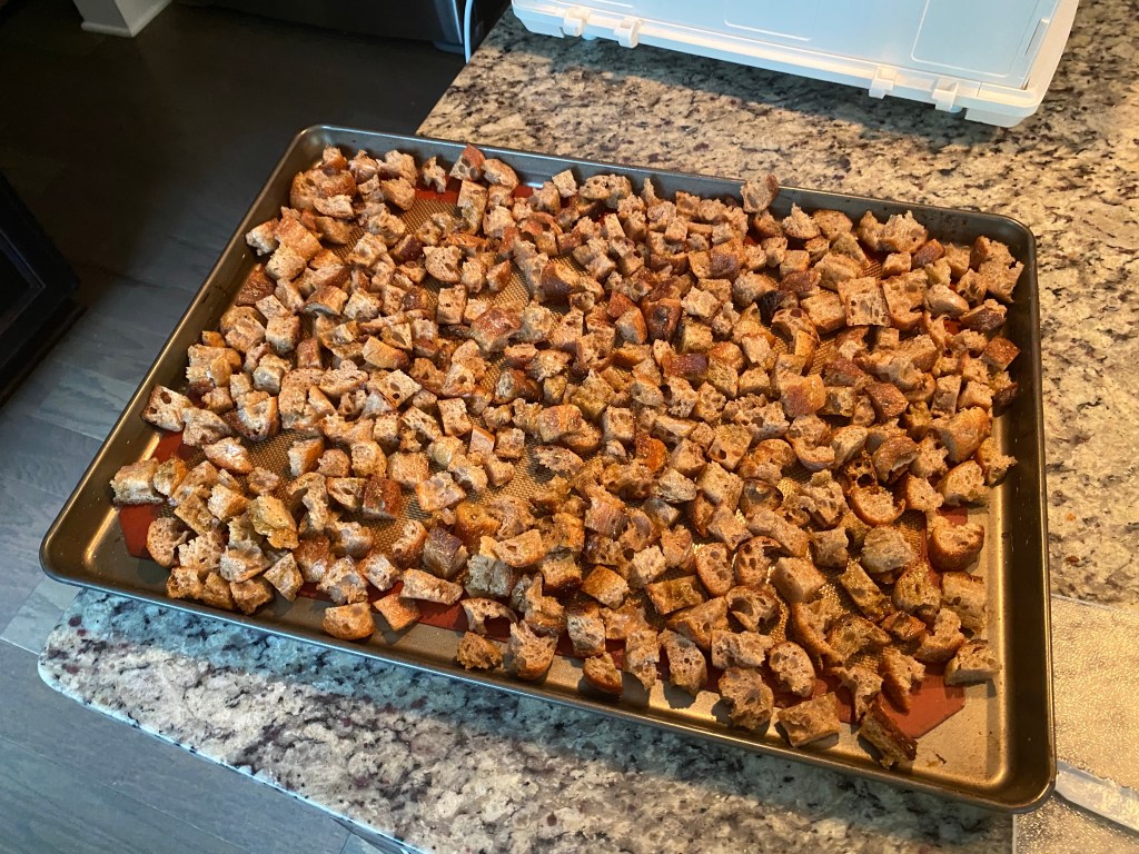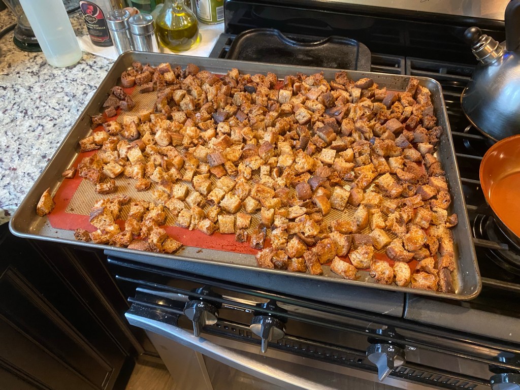 I had enough croutons to fill a full-size baking tray. I’ll bake at 400°F for about 15 minutes flight ping them around mid-bake to get a more even color.