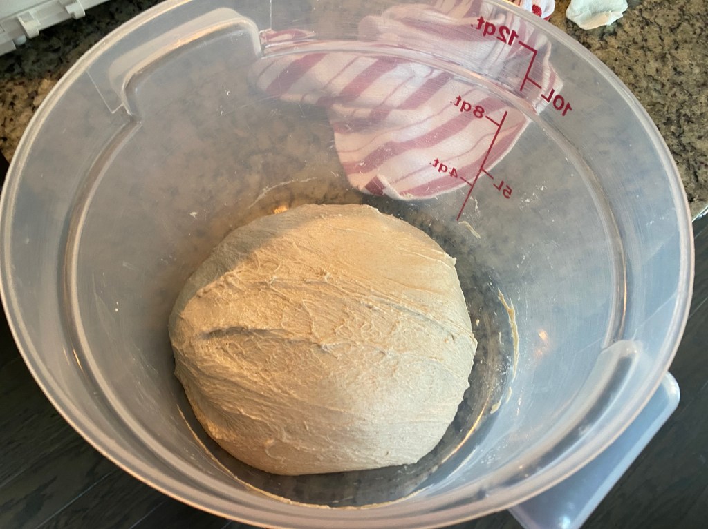 Letting the dough bulk prove until roughly doubled in size. Once there I’ll divide shape and bulk longer at room temperature until this evening (probably until about 9pm and then bake).
