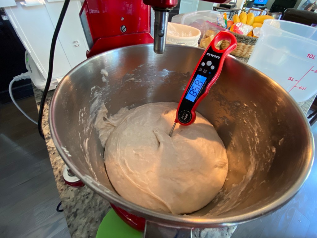 About an hour before I anticipate mixing in my active starter I’ll begin my autolyse adding 104°F to my room temperature flour and get it just over my desired dough temperature of 84°F. Typically it will be around 94°F and cool off over the hour.