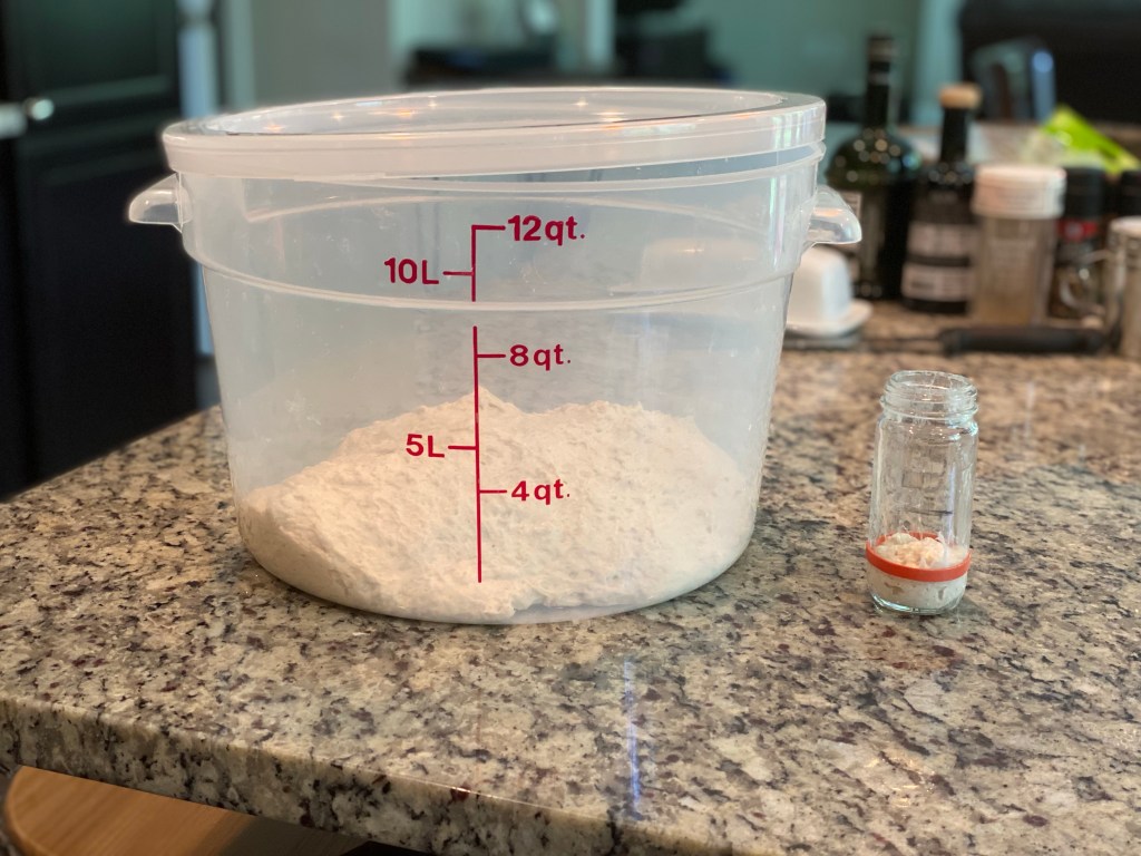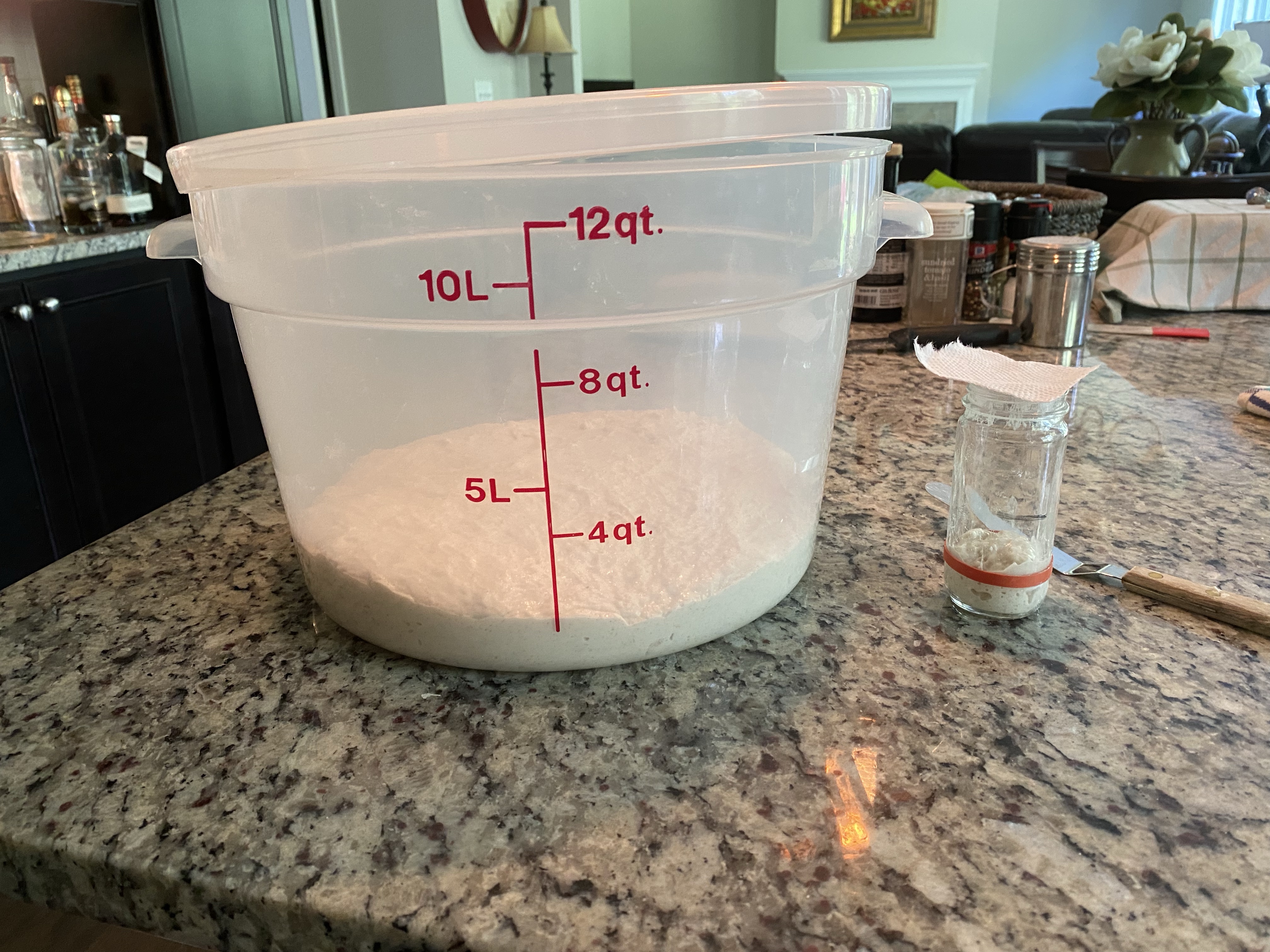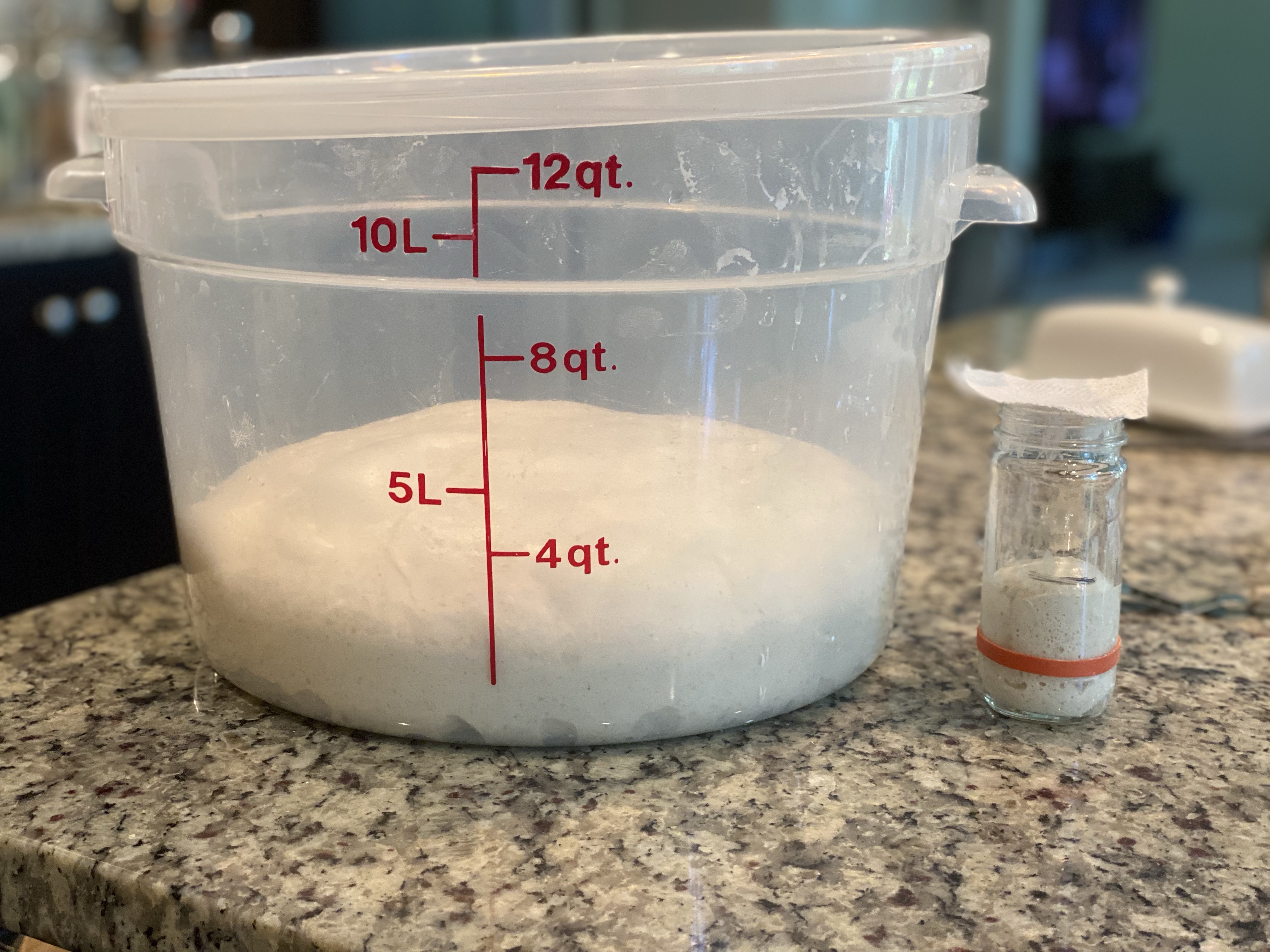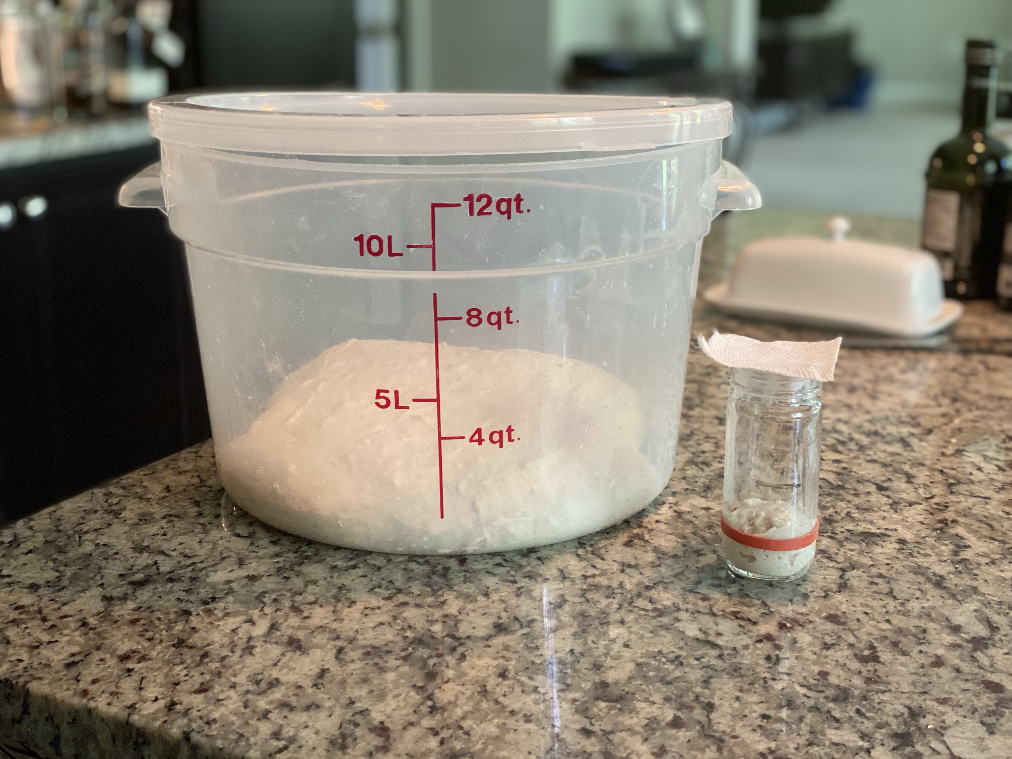 I performed a coil fold to help develop strength and structure in the dough for the first 90 minutes. After that, the dough sat quietly growing until it had doubled as indicated by the Aliquot jar.