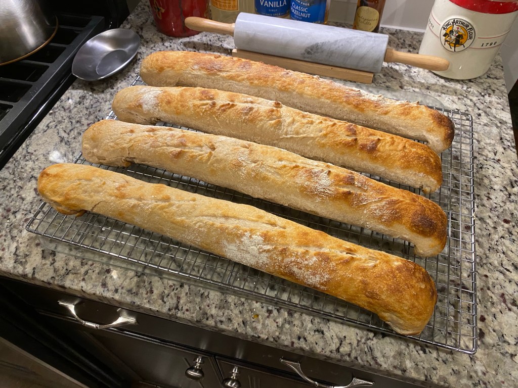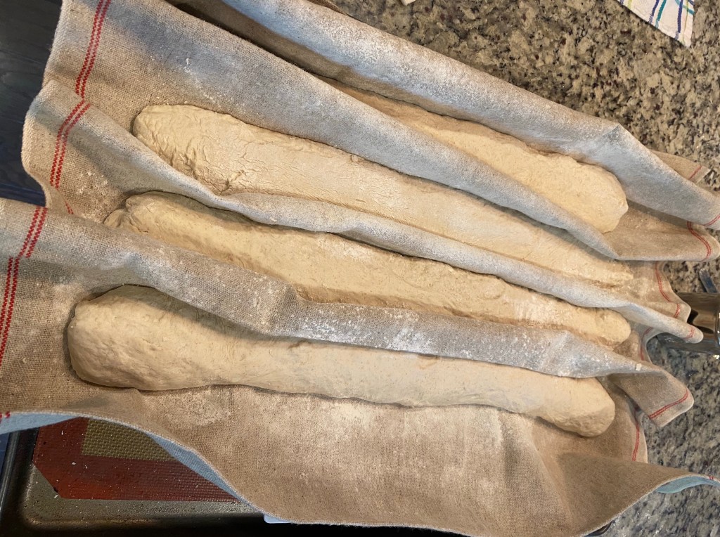 I don’t have any good pics of my dividing or shaping the baguettes. That will need to be a different post sometime in the future. Had I done one this time it would be a “don’t do this” video.