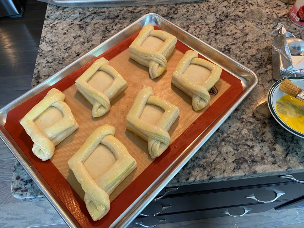 I added the eggs and some AP flour to stiffen it a bit. Bad idea! It kind of Jake’s and ran off the top taking a bunch of the almond slivers with it!
